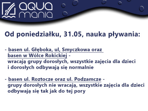 Na pozostałych basenach wszystkie kursy nauki pływania dla dzieci i dorosłych odbywają się normalnie. Ten sam dzień, ta sama godzina co zwykle.