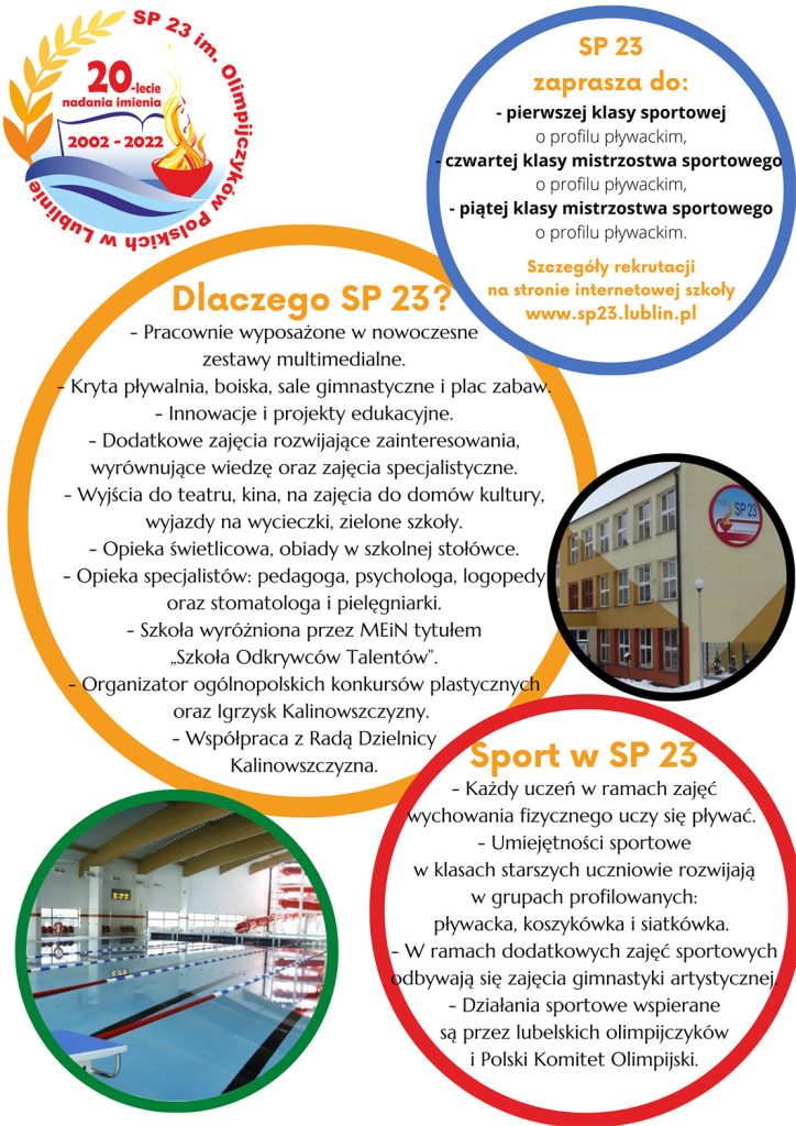 Szkoła Podstawowa nr 23 im. Olimpijczyków Polskich w Lublinie ogłasza rekrutację do klas sportowych o profilu pływackim: