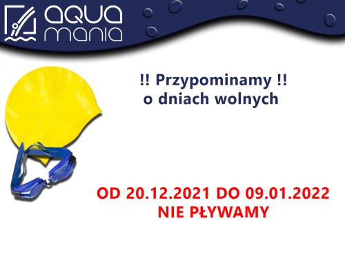 Przypominamy o dniach wolnych od nauki pływania w dniach 20.12.2021 – 09.01.2022.